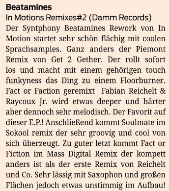 Artist: Beatamines Name: In Motion Remixes #2 Catalog: Damm029 Release: out now Tracklist: A1: "In Motion (Beatamines Synthphony rework)" A2: "Get 2 Gether (Piemont Remix)" B1: "Fact or Fiction (Fabian Reichelt & Raycoux Jr. Remix)" B2: "Soulmate (Sokool Remix)" |
